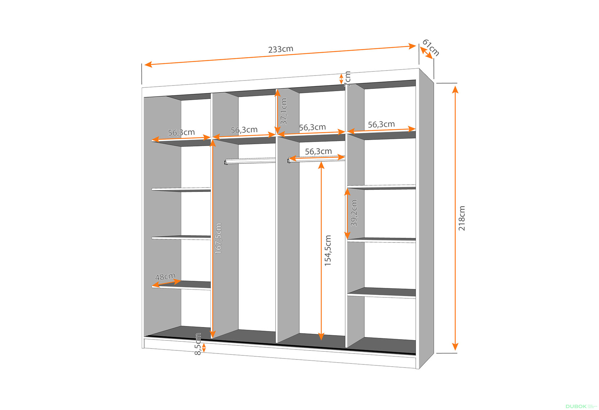 - Veľkosť. S rozmermi 233 cm na šírku, 218 cm na výšku a 61 cm na hĺbku, skriňa ponúka dostatok priestoru pre všetky vaše veci, pričom nezaberá príliš veľa miesta v miestnosti.