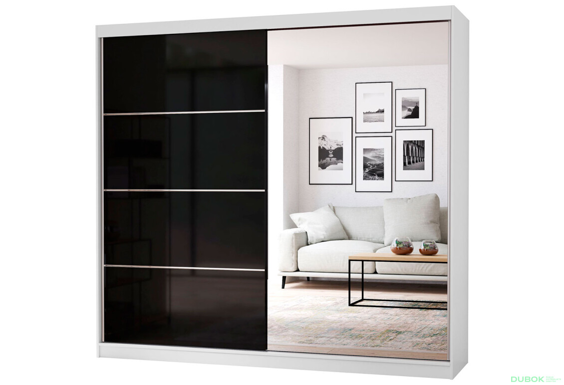 Skriňa Multi 31 je ideálnym riešením pre tých, ktorí hľadajú moderný a funkčný nábytok do svojich interiérov. S rozmermi 233 cm na šírku, 218 cm na výšku a 61 cm na hĺbku ponúka dostatok úložného priestoru, pričom jej elegantný dizajn s čiernym leskom a zrkadlovou fasádou dodáva každému priestoru nádych luxusu. Posuvné dvere zabezpečujú jednoduchý prístup k obsahu skrine a šetria miesto, čo je obzvlášť výhodné v menších priestoroch. Vnútorné usporiadanie skrine, ktoré obsahuje police a tyč na oblečenie, vám umožňuje efektívne organizovať vaše veci a udržiavať ich v poriadku.