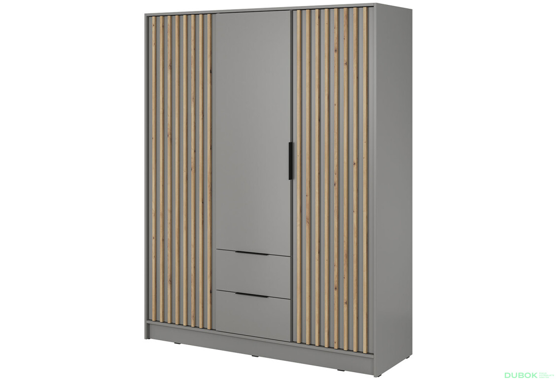 Skriňa Nelly 3D bez zrkadla šedá je ideálnym riešením pre tých, ktorí hľadajú moderný a funkčný nábytok do svojho interiéru. S rozmermi 155 cm na šírku, 200 cm na výšku a 51 cm na hĺbku ponúka dostatok úložného priestoru pre oblečenie a ďalšie osobné veci. Trojdverové prevedenie s otváracími dverami zabezpečuje jednoduchý prístup k obsahu skrine. Laminovaný povrch z drevotriesky v elegantnom šedom dekore dodáva skrini moderný vzhľad, ktorý sa hodí do rôznych štýlov interiéru. Vnútorné usporiadanie skrine je premyslené, obsahuje police, tyč na oblečenie a zásuvky, čo zaručuje maximálnu funkčnosť a prehľadnosť.