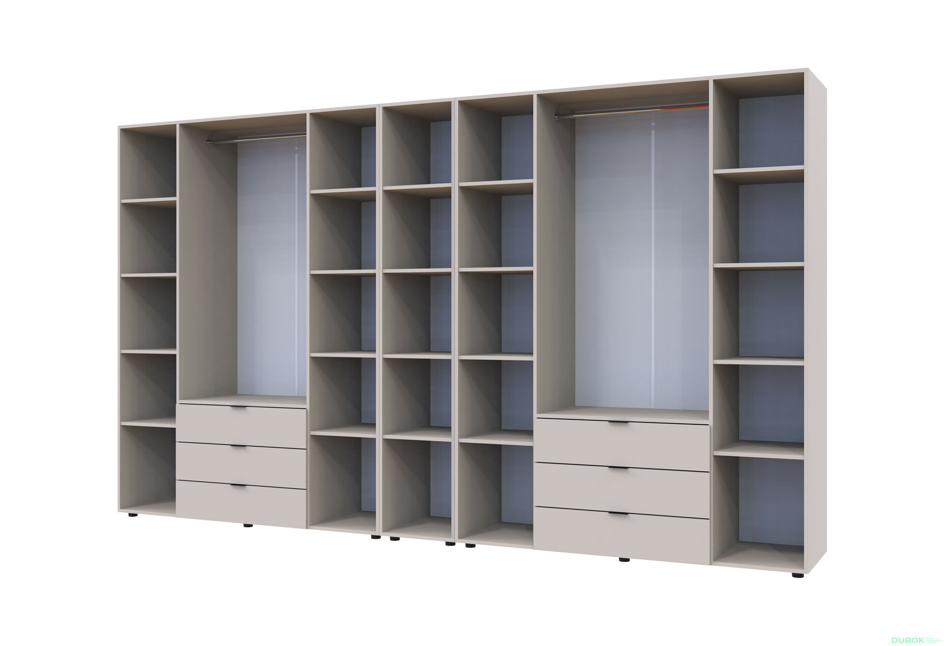 - Vnútorné usporiadanie. Obsahuje police, tyč na oblečenie a zásuvky, čo zabezpečuje organizáciu a efektívne využitie priestoru.