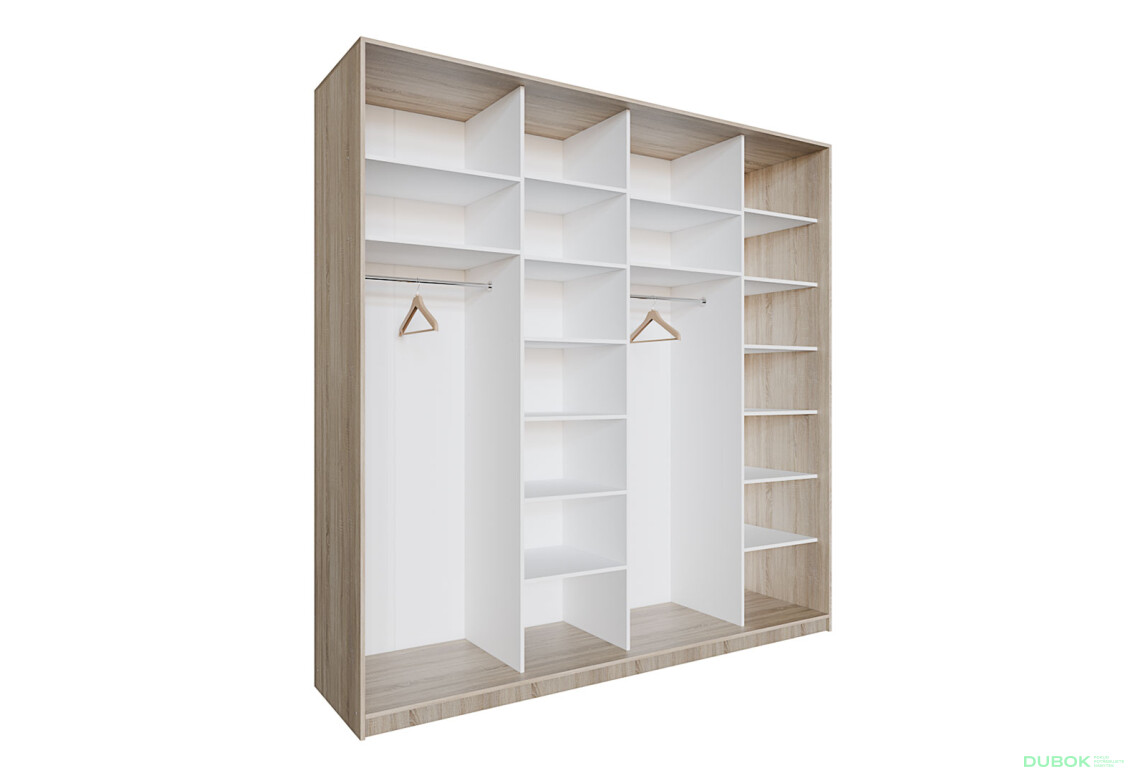 - Vnútorné usporiadanie. Obsahuje police a tyč na zavesenie oblečenia, čo zabezpečuje prehľadnosť a efektívne využitie priestoru.