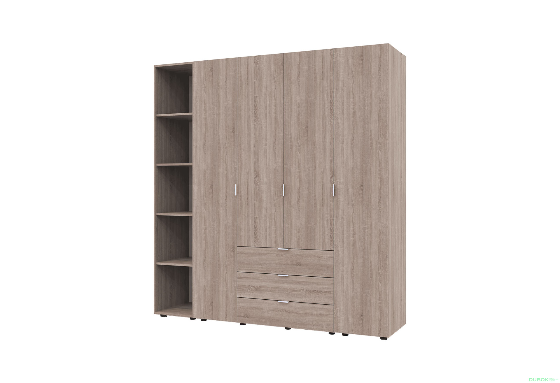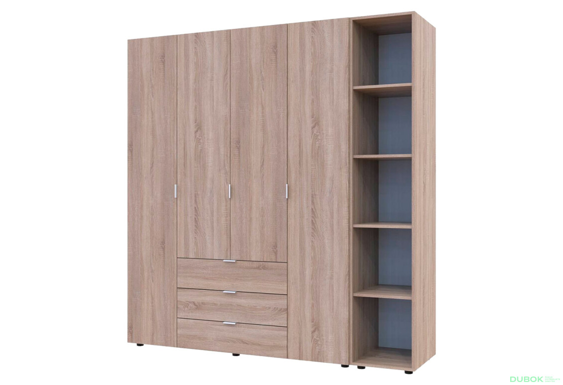 Štvordverová skriňa s regálom Gelar je ideálnym riešením pre tých, ktorí hľadajú moderný a funkčný nábytok do svojho domova. S rozmermi 193,2 cm na šírku a 203,4 cm na výšku ponúka dostatok úložného priestoru pre oblečenie, obuv a ďalšie veci. Skriňa je vyrobená z kvalitnej drevotriesky s laminovanou povrchovou úpravou, čo zabezpečuje jej odolnosť a jednoduchú údržbu. Vnútorné usporiadanie zahŕňa police, tyč na zavesenie oblečenia a praktické zásuvky, čo zaručuje prehľadnosť a organizovanosť. Moderný dekor dub sonoma dodáva nábytku elegantný vzhľad, ktorý sa hodí do rôznych interiérov.