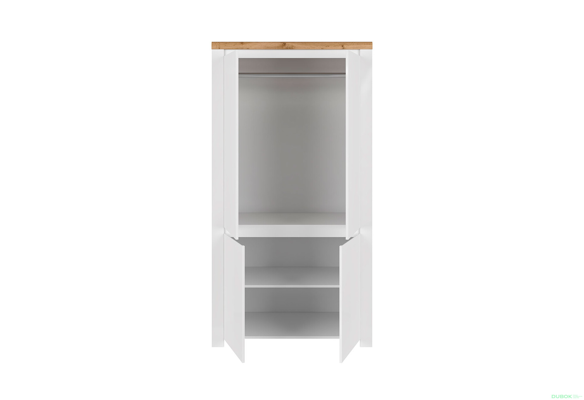 - Štýlový dizajn. Vidiecky štýl s bielym leskom a dekorom dub wotan je moderný a nadčasový, čo zaručuje, že skriňa sa hodí do rôznych interiérov.