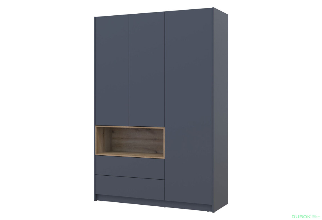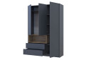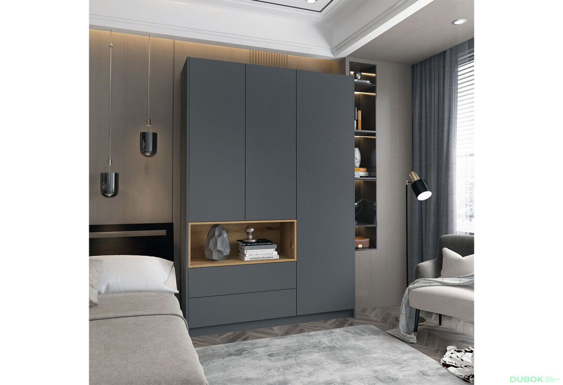 Trojdverová skriňa Dale je ideálnym riešením pre moderné interiéry, kde sa kladie dôraz na funkčnosť a estetiku. S rozmermi 150x52x220 cm ponúka dostatok úložného priestoru, pričom vnútorné usporiadanie zahŕňa police, tyč na oblečenie a praktické zásuvky. Jej elegantný dekor v kombinácii grafitu a eukalyptového dubu dodáva priestoru nadčasový vzhľad, ktorý sa hodí do každého moderného domova. Skriňa je vyrobená z kvalitnej drevotriesky s laminovanou povrchovou úpravou, čo zaručuje jej odolnosť a jednoduchú údržbu. S otváracími dverami a guličkovým vedením zásuviek s plným výsuvom je manipulácia s obsahom skrine veľmi pohodlná.