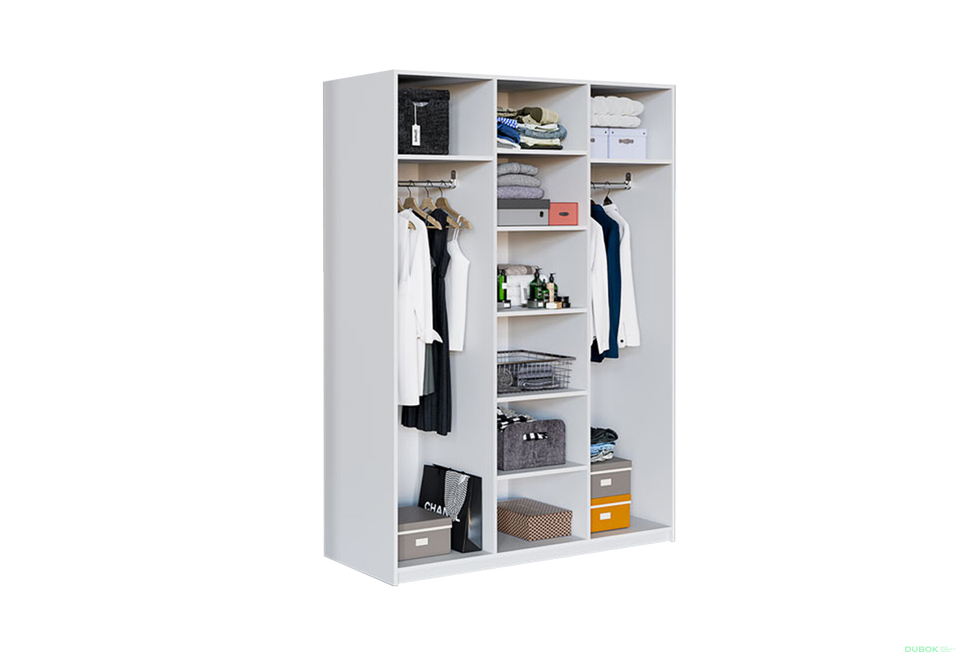 - Vnútorné usporiadanie. Obsahuje police a tyč na oblečenie, čo umožňuje efektívne usporiadanie vecí.