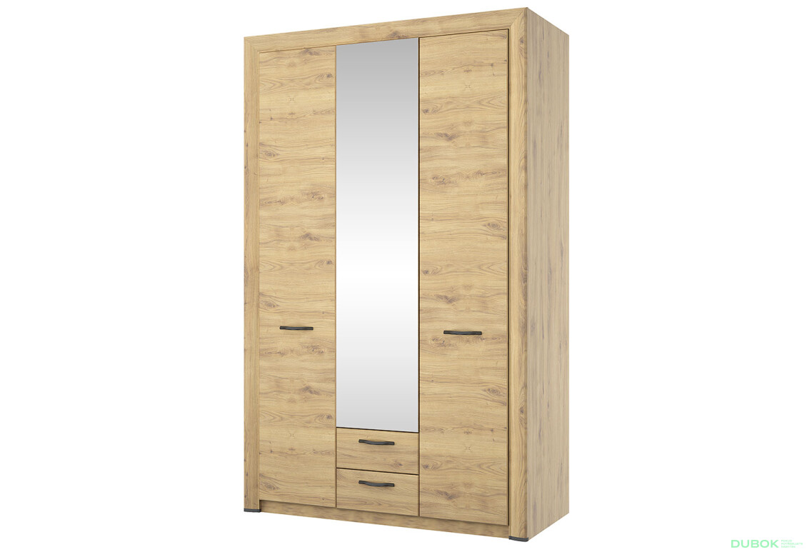 Trojdverová skriňa so zrkadlom a zásuvkami Sapori je ideálnym riešením pre moderné interiéry, ktoré potrebujú praktický a štýlový úložný priestor. S rozmermi 135.8 cm na šírku, 217.1 cm na výšku a 60.3 cm na hĺbku, ponúka dostatok miesta na oblečenie a doplnky. Jej elegantný dizajn s patinovaným povrchom v dekore dub navarra a kovovými úchytkami dodáva priestoru sofistikovanosť. Vnútorné usporiadanie zahŕňa police, tyč na oblečenie a zásuvky, čo zabezpečuje maximálnu funkčnosť a prehľadnosť v usporiadaní vašich vecí. Skriňa je vyrobená z kvalitných materiálov, ako sú drevotrieska, MDF a sklo, čo zaručuje jej dlhú životnosť a odolnosť.