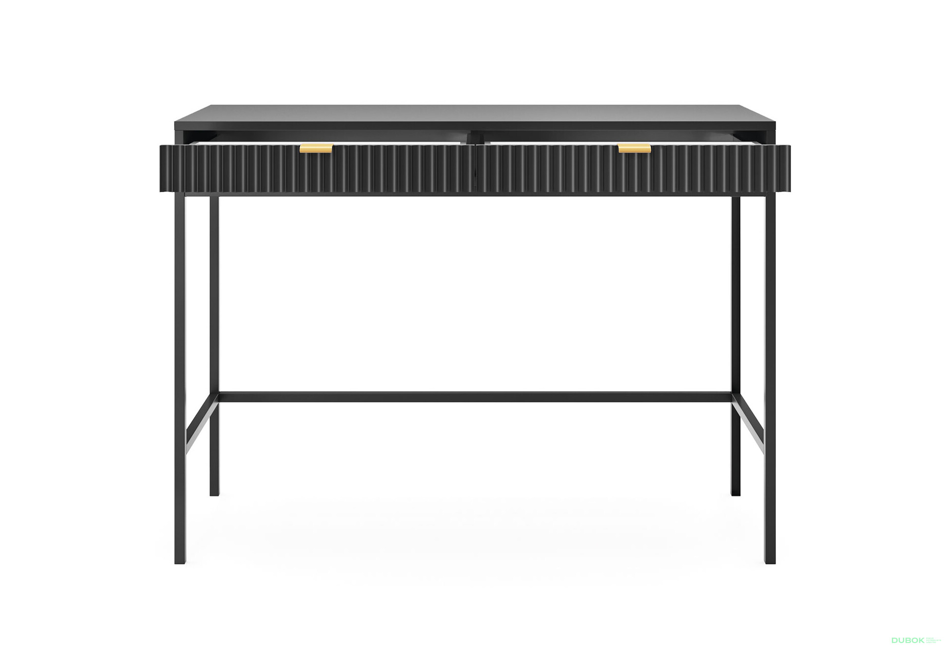 Toaletný stolík T104 v elegantnej čiernej farbe s kovovými nohami a zlatými úchytkami je ideálnym doplnkom pre váš domov, ktorý spojí moderný dizajn so škandinávskym štýlom. S rozmermi 104 cm na šírku, 78 cm na výšku a 50 cm na hĺbku, ponúka dostatok priestoru na uloženie vašich kozmetických potrieb a osobných vecí. Tento stolík, vyrobený z kvalitnej drevotriesky a MDF, je nielen esteticky príjemný, ale aj funkčný, čím sa stáva praktickým riešením pre každú spálňu. Bez zrkadla, ale s možnosťou doplnenia, je ideálny pre tých, ktorí preferujú minimalistický vzhľad.