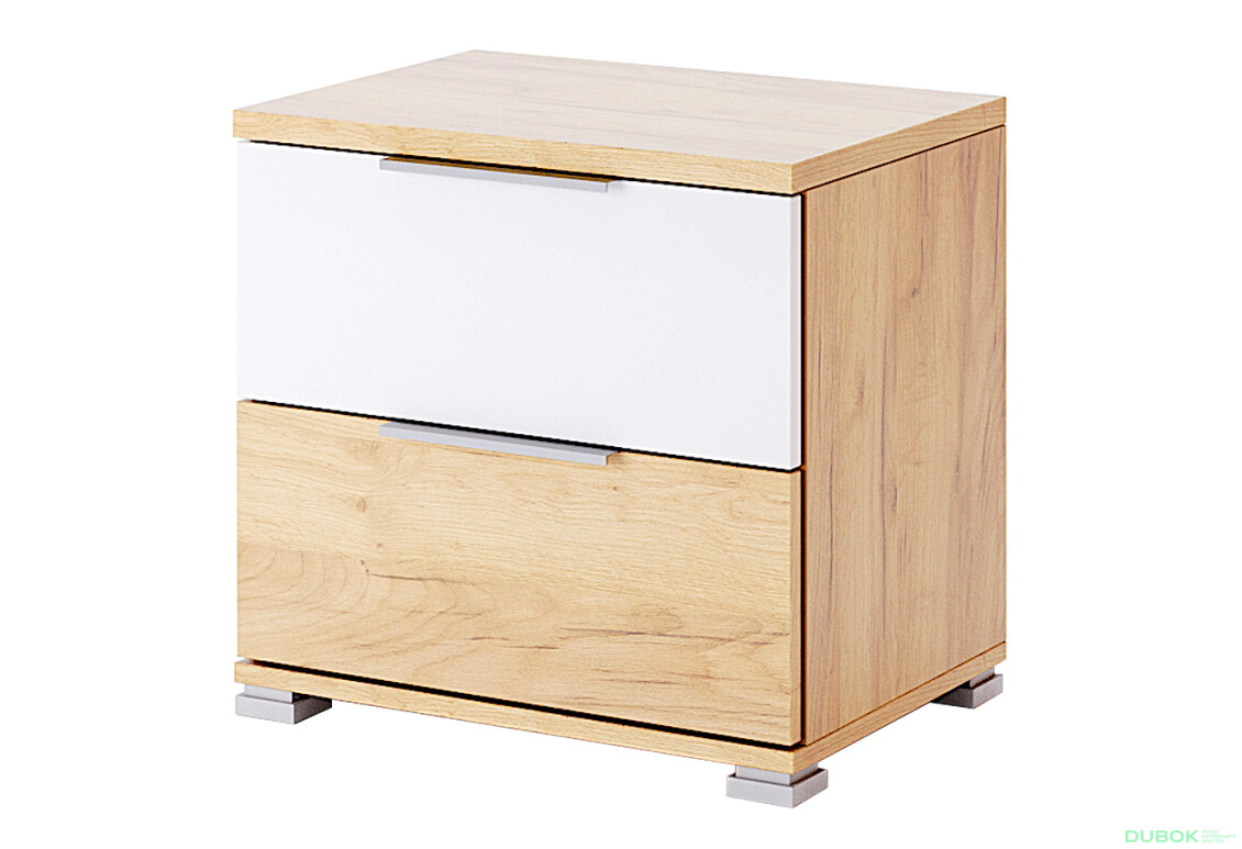 Nočný stolík 2 zásuvky dub kraft / biely Asti je ideálnym doplnkom pre vašu spálňu, ktorý kombinuje moderný dizajn s praktickosťou. Jeho elegantný vzhľad v dekore dub kraft a biely povrch dodáva priestoru sviežosť a štýlovosť. Stolík je vybavený dvoma zásuvkami, ktoré poskytujú dostatok úložného priestoru pre vaše osobné veci, knihy alebo drobnosti, ktoré chcete mať po ruke. S jeho kompaktnými rozmermi (šírka 49.60 cm, výška 47.00 cm, hĺbka 36.00 cm) sa hodí aj do menších priestorov, pričom nezaberá veľa miesta. Materiál prednej strany je vyrobený z kvalitnej drevotriesky s lesklou laminovanou povrchovou úpravou, čo zaručuje nielen estetický vzhľad, ale aj jednoduchú údržbu. Kovová úchytka a guličkové vedenie plného výsuvu zásuviek zaručujú pohodlné a tiché otváranie.
