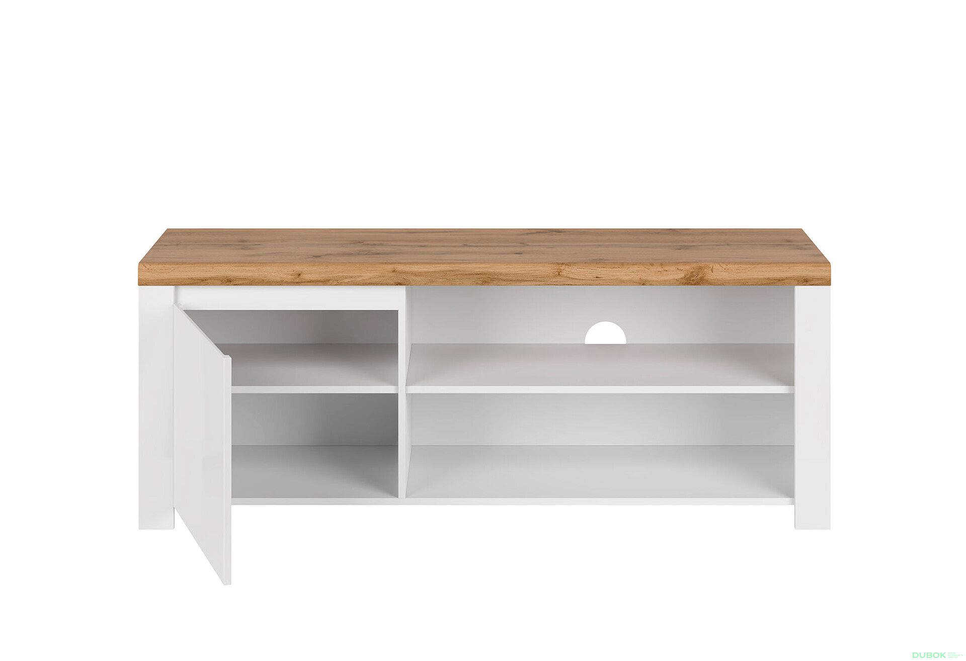 TV stolík 1d/160 v bielom lesku a dubovom dekore Wotan je ideálnym riešením pre tých, ktorí hľadajú moderný a funkčný nábytok do svojho obývacieho priestoru. Tento elegantný stolík v vidieckom štýle ponúka dostatok úložného priestoru, pričom jeho lesklý povrch dodáva interiéru nádych luxusu. S rozmermi 156 cm na šírku, 61 cm na výšku a 41,5 cm na hĺbku je dostatočne priestranný na umiestnenie televízora a ďalších multimediálnych zariadení. Kvalitné materiály, ako sú MDF pre prednú stranu a drevotrieska pre korpus, zabezpečujú dlhú životnosť a odolnosť voči každodennému používaniu. Tento stolík je praktickým a estetickým doplnkom, ktorý skvele zapadne do každého moderného domova. Objednajte si ho ešte dnes na dubok.sk.