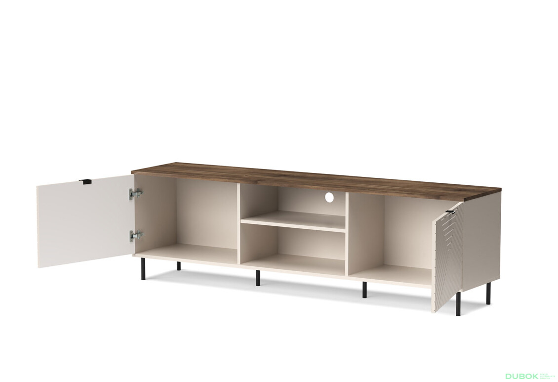 TV stolík 2d/180 [EO3] v elegantnej kombinácii kašmíru a dubu castello je ideálnym riešením pre moderné obývacie izby. S rozmermi 183,40 cm na šírku, 55,20 cm na výšku a 40,00 cm na hĺbku ponúka dostatok úložného priestoru v podobe políc a dvierok. Tento stolík je navrhnutý tak, aby spĺňal požiadavky na funkčnosť a estetiku, pričom jeho moderný štýl sa dokonale hodí do každého interiéru. Kvalitná laminovaná povrchová úprava zabezpečuje jeho odolnosť a jednoduchú údržbu, zatiaľ čo kovové úchytky a nohy dodávajú nábytku stabilitu a sofistikovanosť. S týmto TV stolíkom získate nielen praktický, ale aj štýlový kus nábytku, ktorý sa stane centrom pozornosti vo vašej obývačke.