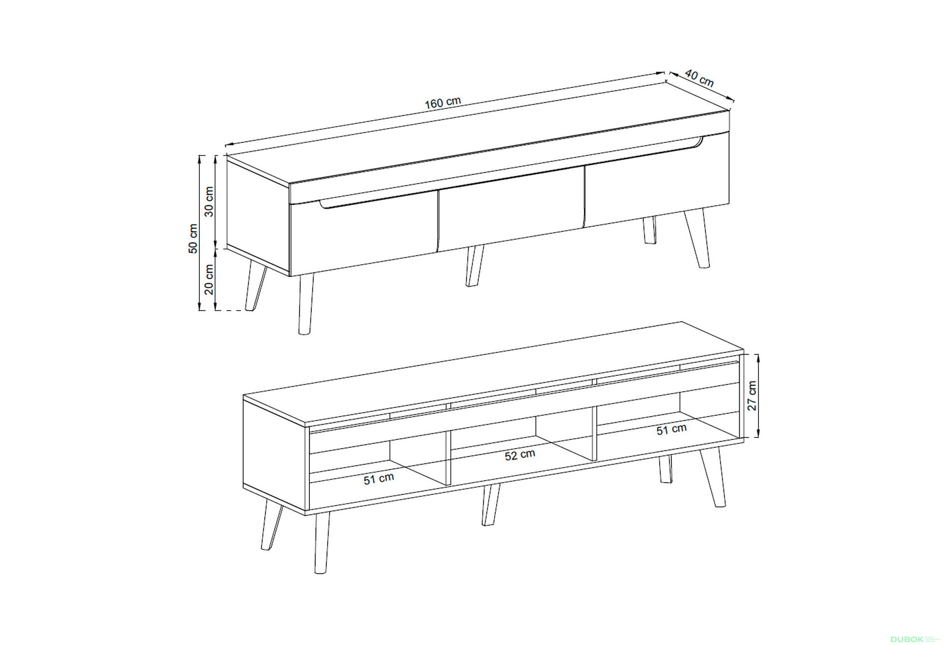 - Veľkosť. S rozmermi 160 cm x 50 cm x 40 cm je stolík dostatočne priestranný na umiestnenie televízora a ďalších zariadení.