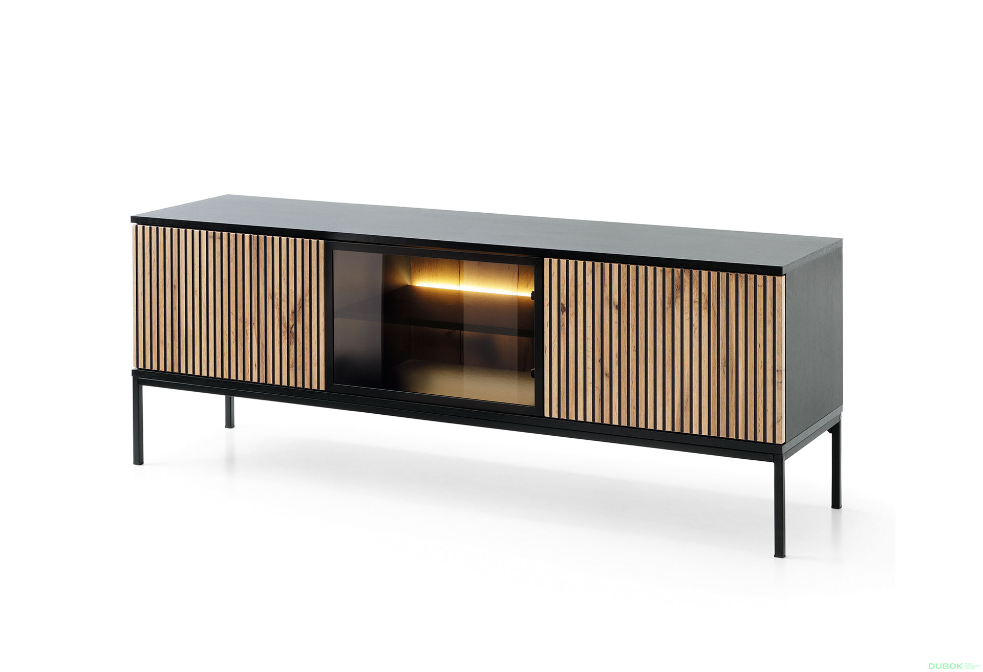 TV stolík RTV154 1 pkt Led Sento čierny / dub wotan je moderný a funkčný kus nábytku, ktorý skvele zapadne do vášho obývacieho priestoru. S rozmermi 154 cm na šírku, 56 cm na výšku a 39 cm na hĺbku ponúka dostatok úložného priestoru s dvierkami, pričom jeho elegantný dizajn kombinuje čiernu farbu s dekorom dub wotan. Stolík je vybavený osvetlením, ktoré dodáva interiéru príjemnú atmosféru. Vďaka push to open úchytke je manipulácia s dvierkami jednoduchá a intuitívna. Korpus je vyrobený z kvalitnej drevotriesky, zatiaľ čo nohy sú kovové, čo zabezpečuje stabilitu a dlhú životnosť produktu. Tento TV stolík je ideálnym riešením pre tých, ktorí hľadajú moderný a praktický nábytok.