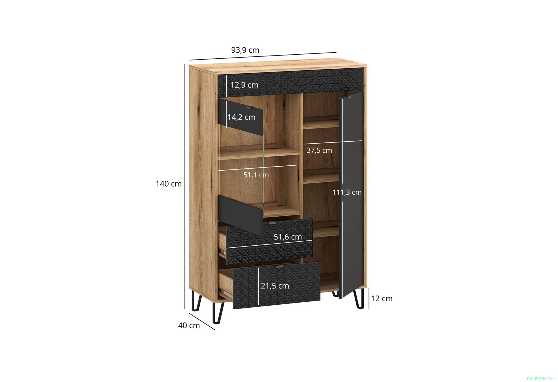 Vitrína nízka 1d1w2s (C2) dub evok / čierny Bellano je skvelým riešením pre moderné interiéry, ktoré potrebujú praktický a estetický kus nábytku. S rozmermi 93.90 cm na šírku, 140.00 cm na výšku a 40.00 cm na hĺbku, ponúka dostatok priestoru na vystavenie kníh, dekorácií alebo iných osobných predmetov. Vitrína je navrhnutá v modernom štýle s elegantným dekorom evokujúceho duba a čiernej farby, čo jej dodáva nadčasový vzhľad. Kovové úchytky a nohy zaisťujú nielen stabilitu, ale aj sofistikovaný vzhľad. Vďaka guličkovému vedeniu plného výsuvu zásuviek je manipulácia s nimi jednoduchá a pohodlná. Možnosť osvetlenia políc pridáva na atraktivite a funkčnosti tohto nábytku, čím sa stáva ideálnym doplnkom do obývacej izby alebo študovne.