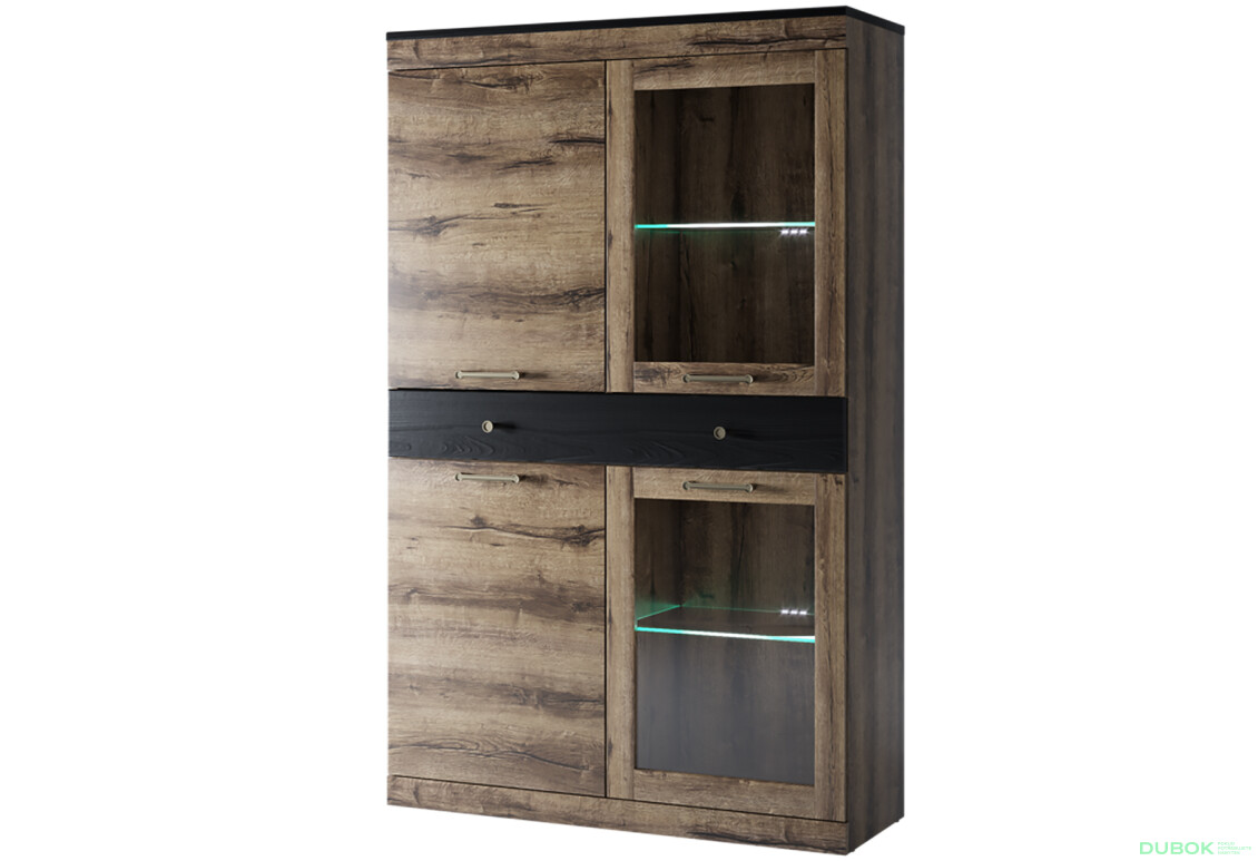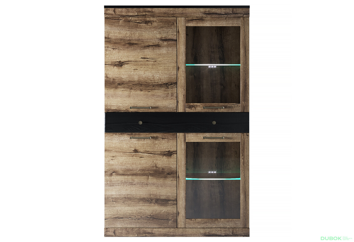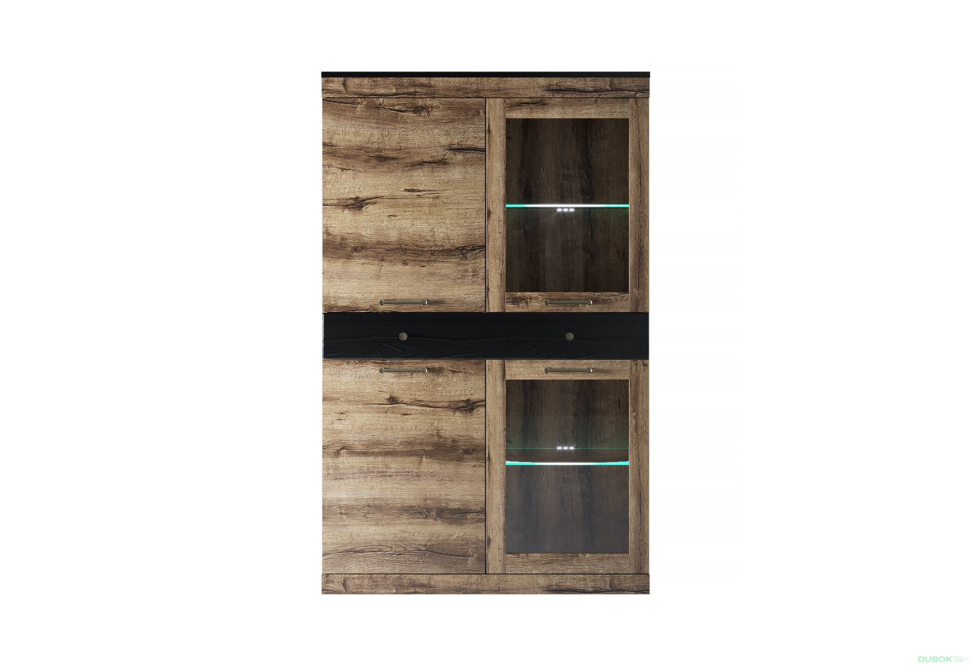 Vitrína nízka 2d2w1s dub monastery / čierny Jagger je moderný kus nábytku, ktorý skvele zapadne do akéhokoľvek interiéru. Jej elegantný dizajn a praktické funkcie ju robia ideálnou voľbou pre tých, ktorí hľadajú kombináciu estetiky a funkčnosti. Vitrína s rozmermi 100 cm na šírku, 159 cm na výšku a 35,3 cm na hĺbku ponúka dostatok priestoru na uskladnenie vašich obľúbených kníh, dekorácií alebo iných predmetov. Vďaka možnosti osvetlenia môžete vytvoriť príjemnú atmosféru a zvýrazniť to, čo je pre vás dôležité. Vitrína je vyrobená z kvalitnej drevotriesky s laminovanou povrchovou úpravou, čo zaručuje jej dlhú životnosť a jednoduchú údržbu. Kovové úchytky a guličkové vedenie plného výsuvu zásuviek zaisťujú pohodlné a bezproblémové používanie.